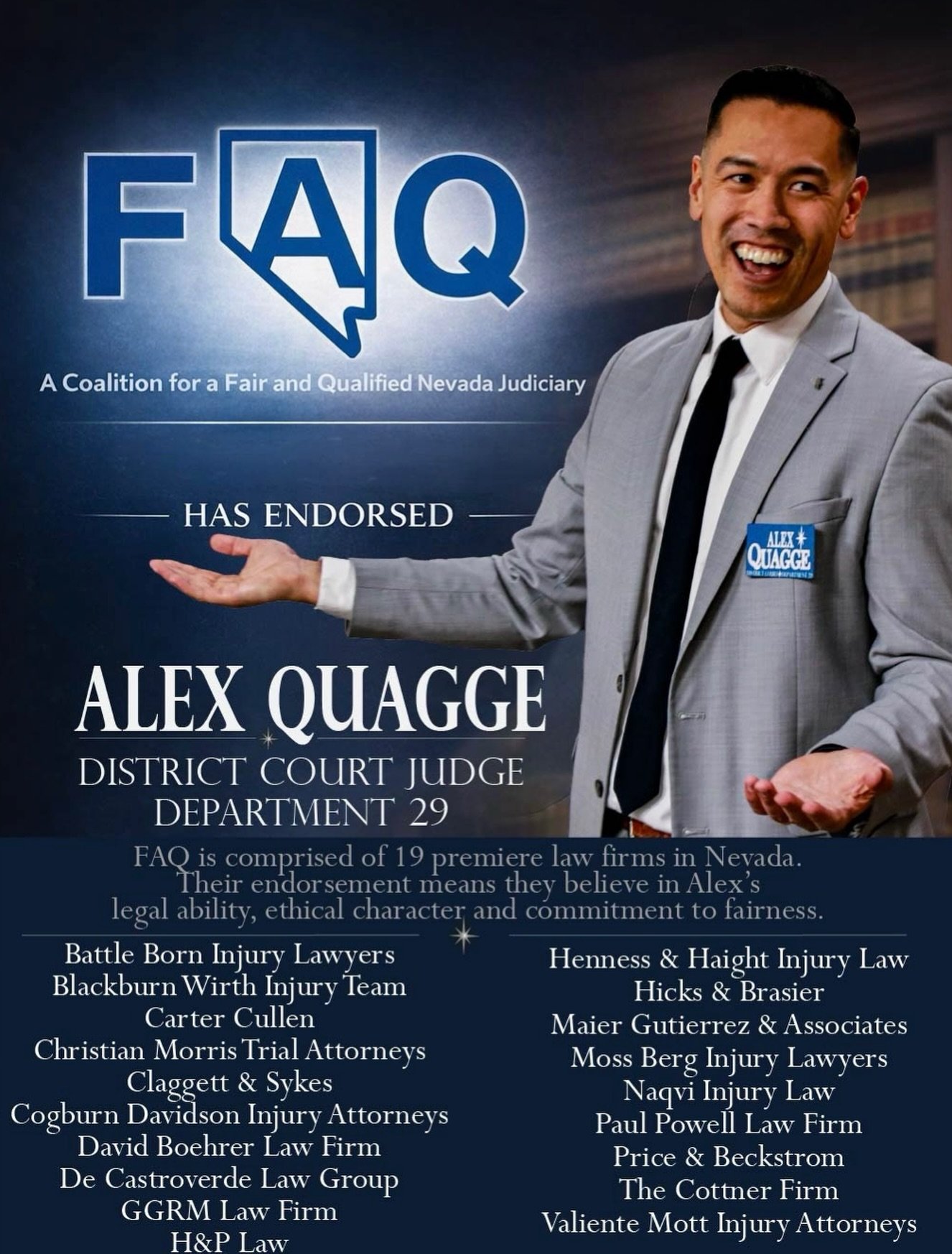 View fullsize I’m honored to earn the endorsement of FAQ, A Coalition for a Fair and Qualified Nevada Judiciary, and grateful for the support of these 19 respected Nevada law firms.